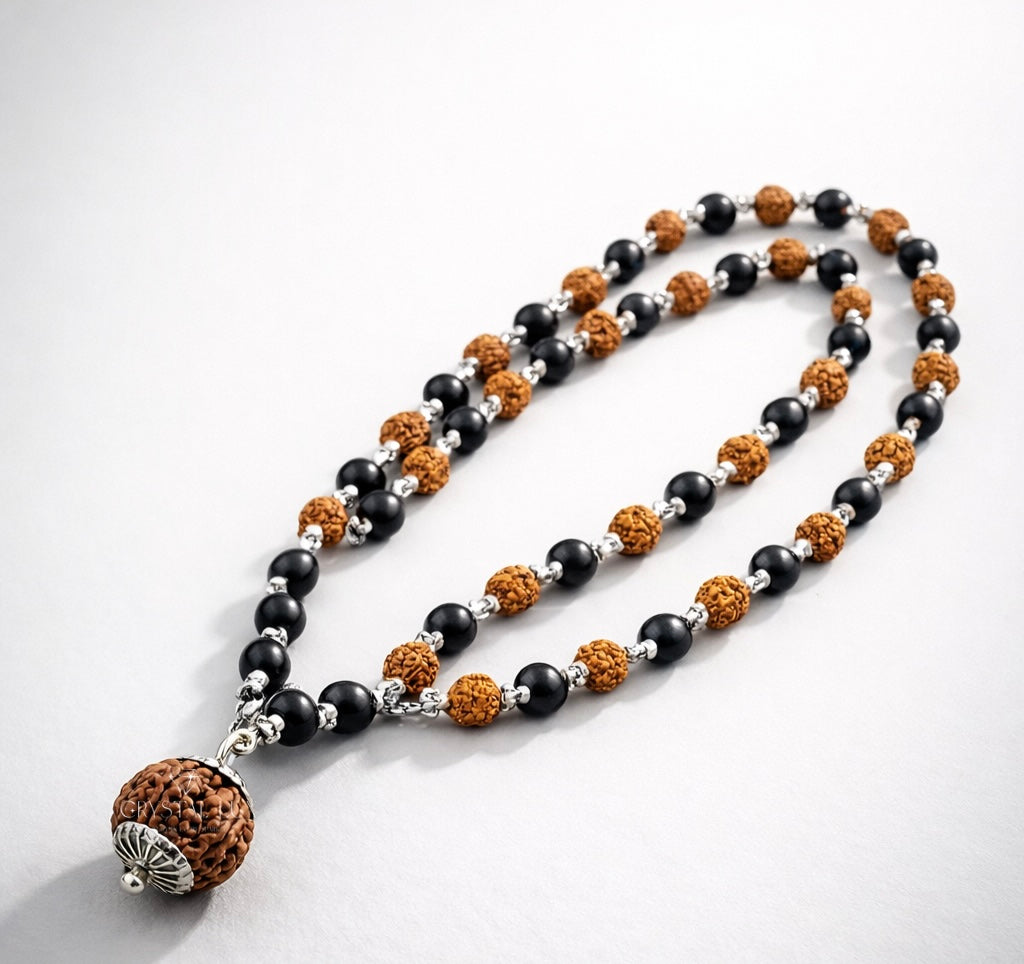 Certified 5 Mukhi Rudraksha & Karungali (Ebony) Mala | Spiritual Protection & Meditation Necklace