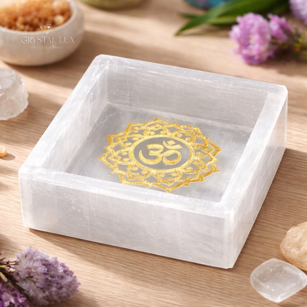 Selenite Charging Box 3×3 Inch with Gold Om | Crystal Cleanser & Energy Charger