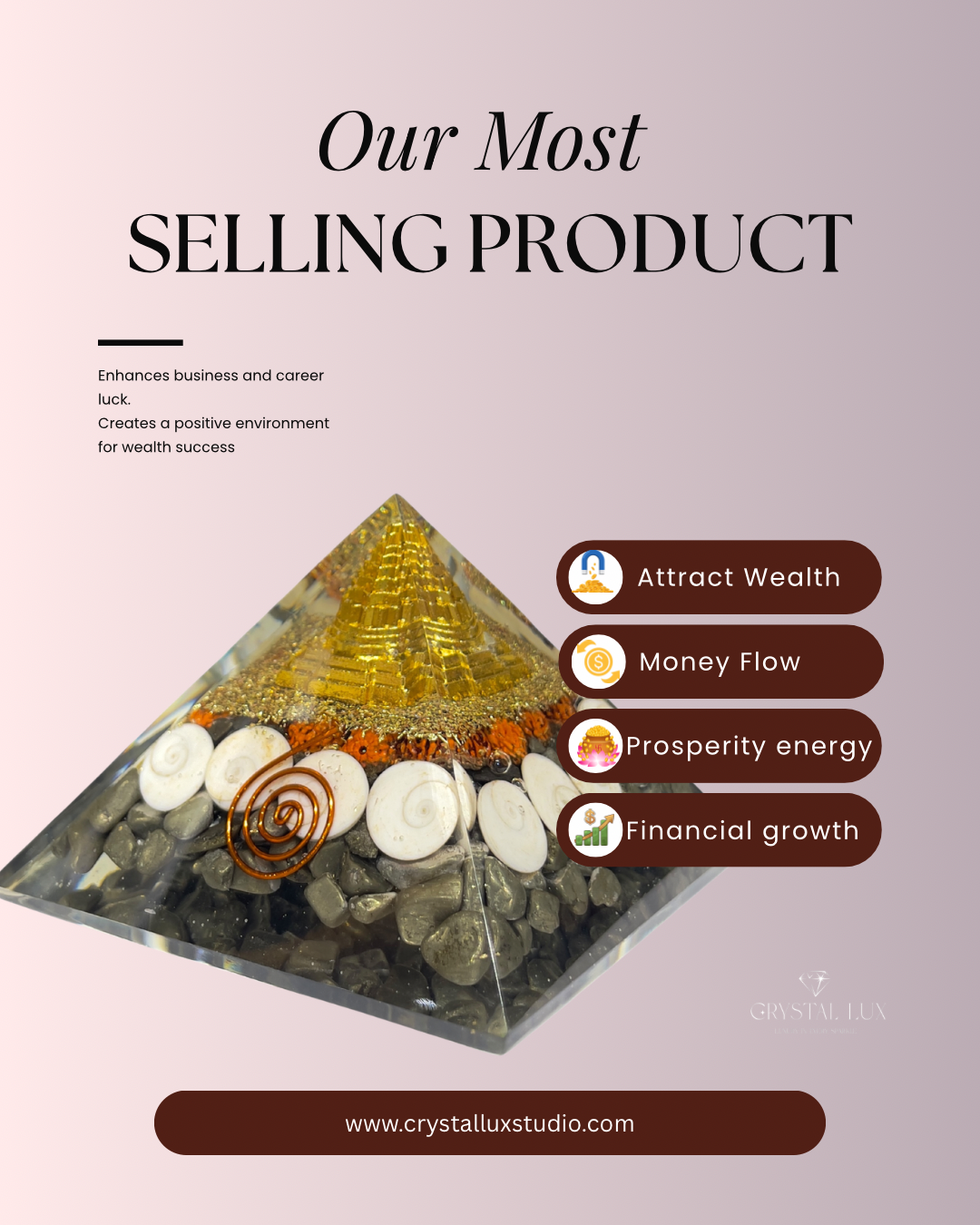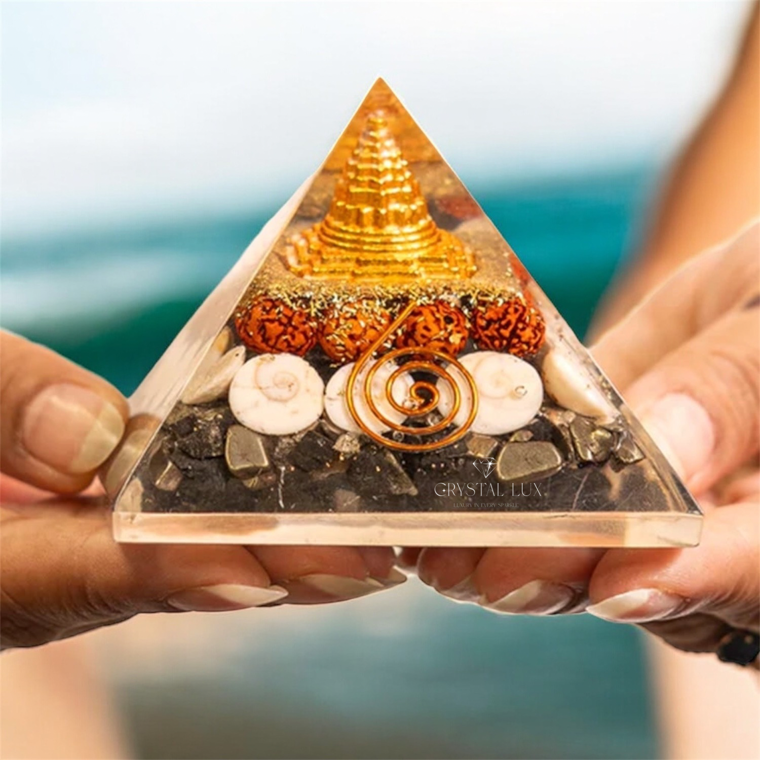 This pyramid combines sacred Vedic elements such as Shree Yantra, Gomti Chakra, Rudraksha, Copper Coil and Peruvian Pyrite, making it one of the most effective prosperity tools for business, success and abundance manifestation.